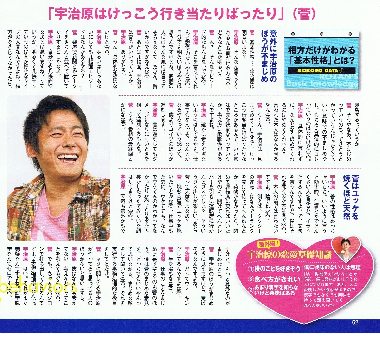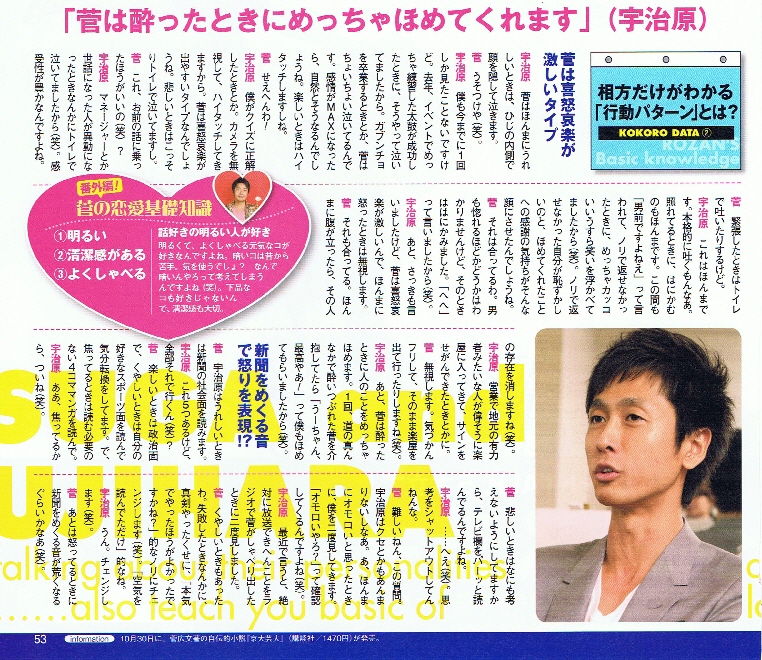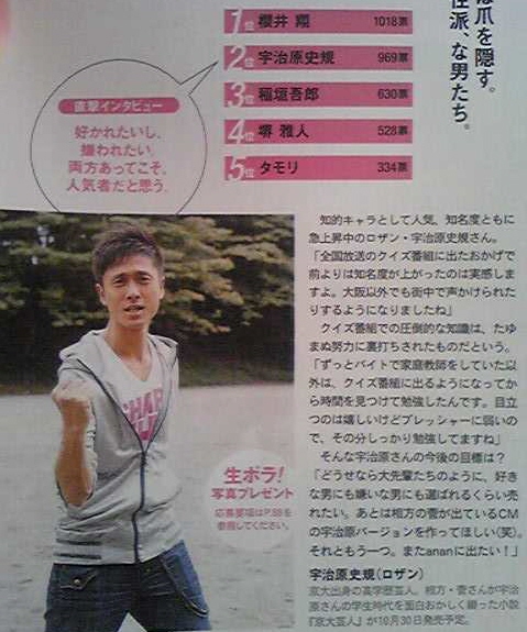 というかパソコンで見ないと 理解できないと思われます ![]() 御了承くださいまし~! ども~ \(^o^)/さて、関ジャニ∞のNEWシングル、 「無責任ヒーロー」 今日予約してきました ![]() 限定盤のAとBの2枚 ![]() 通常盤は借りる事に (笑)(金欠なのよ~~ )私、ケムリっていう曲好きです ![]() コンサートで歌ってたやつね~ (どーでもいい話ですか?笑) で、本屋に行って お笑いポポロをGET!! ![]() 今日はその雑誌をピックアップします ![]() 前もって言っておきますが、 超ネタバレしますので(笑) 見たくない方はスルー願います。 まぁ~お笑いポポロを 何故買ったかといえば、 ロザンが載ってるからなんだけど(笑) 一応知らん人の為に説明↓ (とはいえ、最近知名度高くなったから 説明も要らん気がする )↑宇治原史規さん。 京大法学部卒のインテリ芸人 ![]() 最近はクイズ番組だけでなく ロンハーなどにも出てます ![]() 月曜はQさまのSP、 火曜はロンハーのSPに出るので お見逃しなく~!!! ↑菅広文さん。 めっちゃ男前でしょ? ![]() 10月23日にアメトーークに出るので、 (ハンサム芸人ということで )お見逃しなく~!!! 今回のテーマは ロザンの相方基礎知識 ということでヾ( ̄ー ̄) 基礎知識は以下の通りです↓ 宇治原さん。 宇治さんは不真面目なのか?? いや、私よりは真面目でしょ(笑) 几帳面ってのはもう有名ですよね~ 几帳面すぎて凄いと思うもん。 本当に宇治さんはB型か ←傍から見たらA型っぽいよな~ 菅さん。 すばるくんもちっちゃいって よく言われるけど、 菅さんはもっとちっちゃい(笑) 162ですよ!? 私、164あるからな~ ![]() ちょ、交換してくれ ←無理菅さんが真面目なのは なんとなく分かるな~ いらちなのも分かるな~ 天然なのは知ってますよ! ![]() 男も惚れる程のはにかみて!笑 菅さんの笑顔は凄いですよね ![]() あの笑顔で何人もの人が救われたか!←え 2人のトーク。 ↑菅さんの笑顔、素敵すぎる ![]() トークの内容は、 画像をクリックすれば 多分見れると思う ![]() (見れなかったらすいません) 以上、 今日はこの辺で失礼します <(_ _)> ほなおつぅ ![]() ということで、 見事宇治原さんが2位獲得 ![]() 因みに1位は桜井翔さん ![]() (ジャニーズには流石に敵わんよな~ 笑)それにしても、 1位と2位の差が49票て 爆桜井さんてかなり人気あるから もっと票差あるのかと思った… 宇治さん凄いじゃないの ![]() 2位と3位の差も339票あるし、 1位と2位はぶっちぎりだね ![]() なんとインタビュー記事は宇治原さん! (桜井さんじゃなかったのね~) …お!ついに宇治さん ananに載ってしまったのね(笑)←何 というか… 宇治原さん、相当このパーカー好きだよね(笑) いや、よく着てらっしゃるから… (勿論似合ってますよ 笑)記事の内容↓ 知的キャラとして人気、知名度ともに 急上昇中のロザン・宇治原史規さん。 「全国放送のクイズ番組に出たおかげで 前よりは知名度が上がったのは実感しま すよ。大阪以外でも街中で声かけられた りするようになりましたね」 クイズ番組での圧倒的な知識は、たゆ まぬ努力に裏打ちされたものだという。 「ずっとバイトで家庭教師をしていた以 外は、クイズ番組に出るようになってか ら時間を見つけて勉強したんです。目立 つのは嬉しいけどプレッシャーに弱いの で、その分しっかり勉強してますね」 そんな宇治原さんの今後の目標は? 「どうせなら大先輩たちのように、好き な男にも嫌いな男にも選ばれるくらい売 れたい。あとは相方の菅が出ているCM の宇治原バージョンを作ってほしい(笑)。 それともう一つ。またananに出たい!」 と、こんな感じ ![]() 宇治原さん人気、凄いな~ ![]() なんか、宇治原さんばっかり 東京の方でもプッシュされてるから 菅さんの事知らない宇治原ファンの方 絶対居ると思うわ ![]() ロザンは2人で1つだし、 宇治原さんが出るのなら 一緒に菅さんも出ればいいのに… な~んて思ったり(;^_^A わたくし、静岡人だから あんま菅さん見れなくて 寂しいんだよーうヾ(=○=;) 出てくれよーう ![]() ←静岡で菅さんが見れる唯一の番組が クイズ紳助くん<(_ _)> 今これを頼りに生きてます (笑)というか、ロザンさん、 11月30日(日)にルミネで 08ベストやるんだってね~ ![]() うわ~めっちゃ行きたい!!! でもチケ の取り方とかまーったく知らんからな( ̄Д ̄;; 行けたら行きたいなぁ ![]() 以上、 今日はロザンの話題のみ! ぁ、2つ∞の話題も(笑) 10月3日だっけ??←おい Mステに出るねー\(^o^)/ ![]() 久々にTVで歌聞けるわ ![]() ![]() 絶対録画しよー!!!v( ̄ー ̄)v あと、錦戸さん、 10月6日のフレンドパークSPに 出るので、お見逃しなく ![]() 【追伸。】 麗美さんのコメレスは、 "9月22日といえば…?" の記事にありますので、 良かったら見て下さい ![]() シブハタでした(T∇T)ノ~~ この記事を見る前に